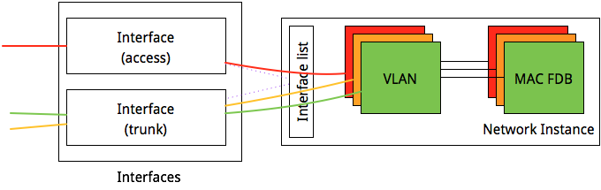 to different network instances (e.g., a VLAN interconnect to an access network,